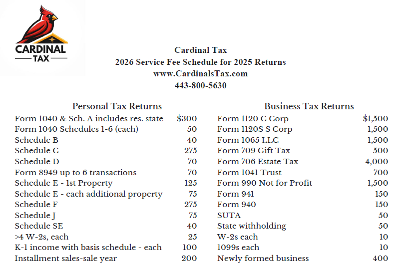CLICK HERE for Cardinal Tax 2026 Menu Pricing for 2025 Returns